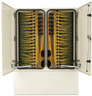 In this design, you have a series of above ground cabinets (I called them cabinets because they are bigger than a typical pedestal). For 6,000 customer locations, you might have 20 cabinets, or about 300 customers per cabinet. You would run backbone cable to each cabinet and terminate your 288 or 576 count cable onto connectors. You then could have ducts or direct burial fiber cable going to each property. For suburban lots, you might have one duct per house, or share a duct for a pair of houses. The cabinet is basically a big cross connect with integrated splice trays (no need for splice closures since the cabinet acts as a splice closure as well). In addition, it would also house PON splitters if you are using a PON architecture.