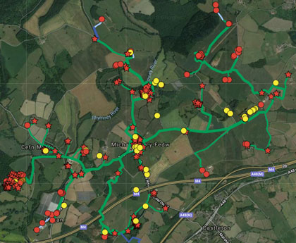 If your customers are more spread out, yet still somewhat clustered, you can use splice closures for all your customer drops. Here's a layout from the Michaelston-y-Fedw network showing how they have many spread out pockets of customers (red circles and stars are customers).