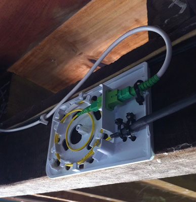 A Fiber Termination Unit (FTU) is a small box that is attached to the side of a house that will act as the transition point from the backbone fiber network to the inside wiring. The box contains one or more fiber connectors and slack storage space for excess fiber. The drop fiber cable comes into the box and is spliced onto a connector pigtail. Some FTUs will have a reel of blowable fiber cable already connectorized, ready to be blown to the street connection point.